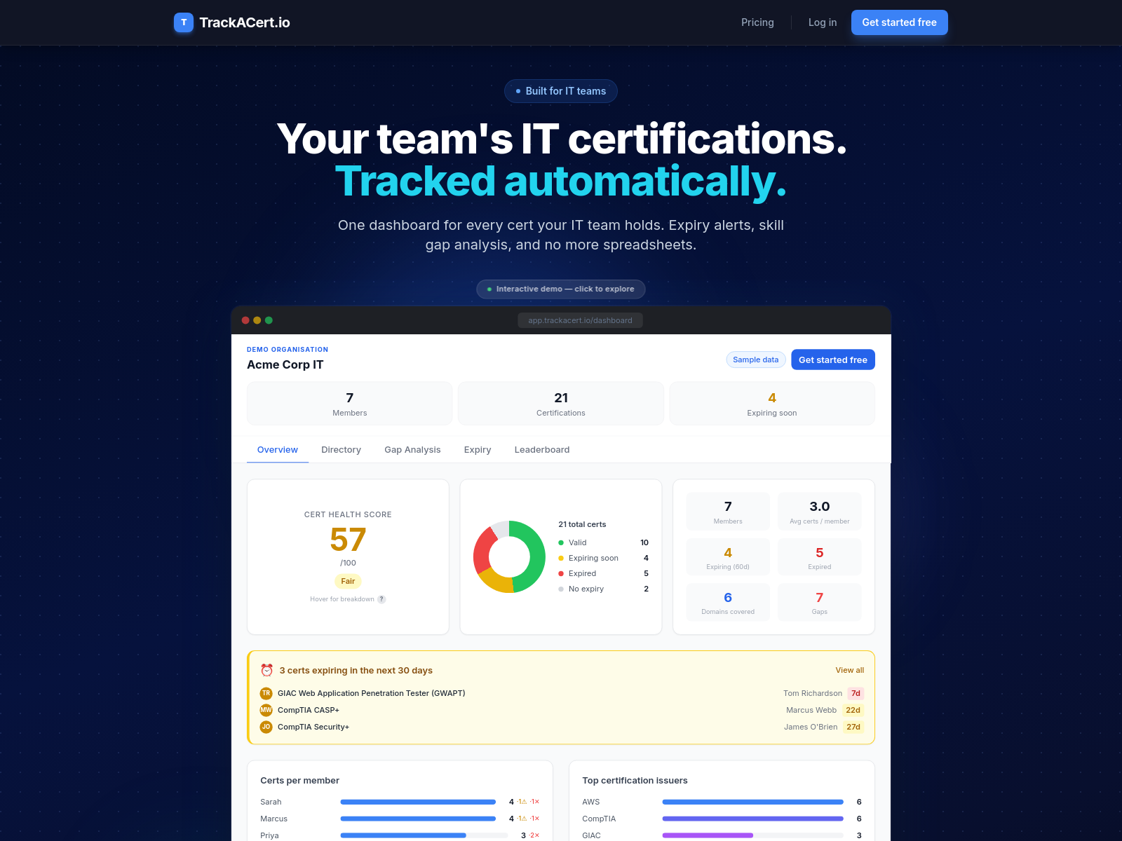 trackacert是一款IT认证追踪工具,可自动导入Credly认证信息、发送到期提醒并生成团队技能分析报告。