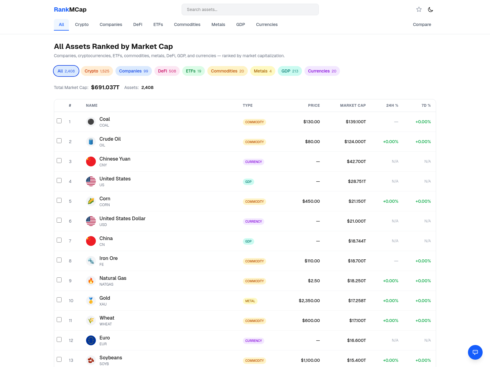 rankmcap是一个整合全球资产市场数据的网站,可对1800+资产进行跨类别排名与对比,每6小时更新一次。