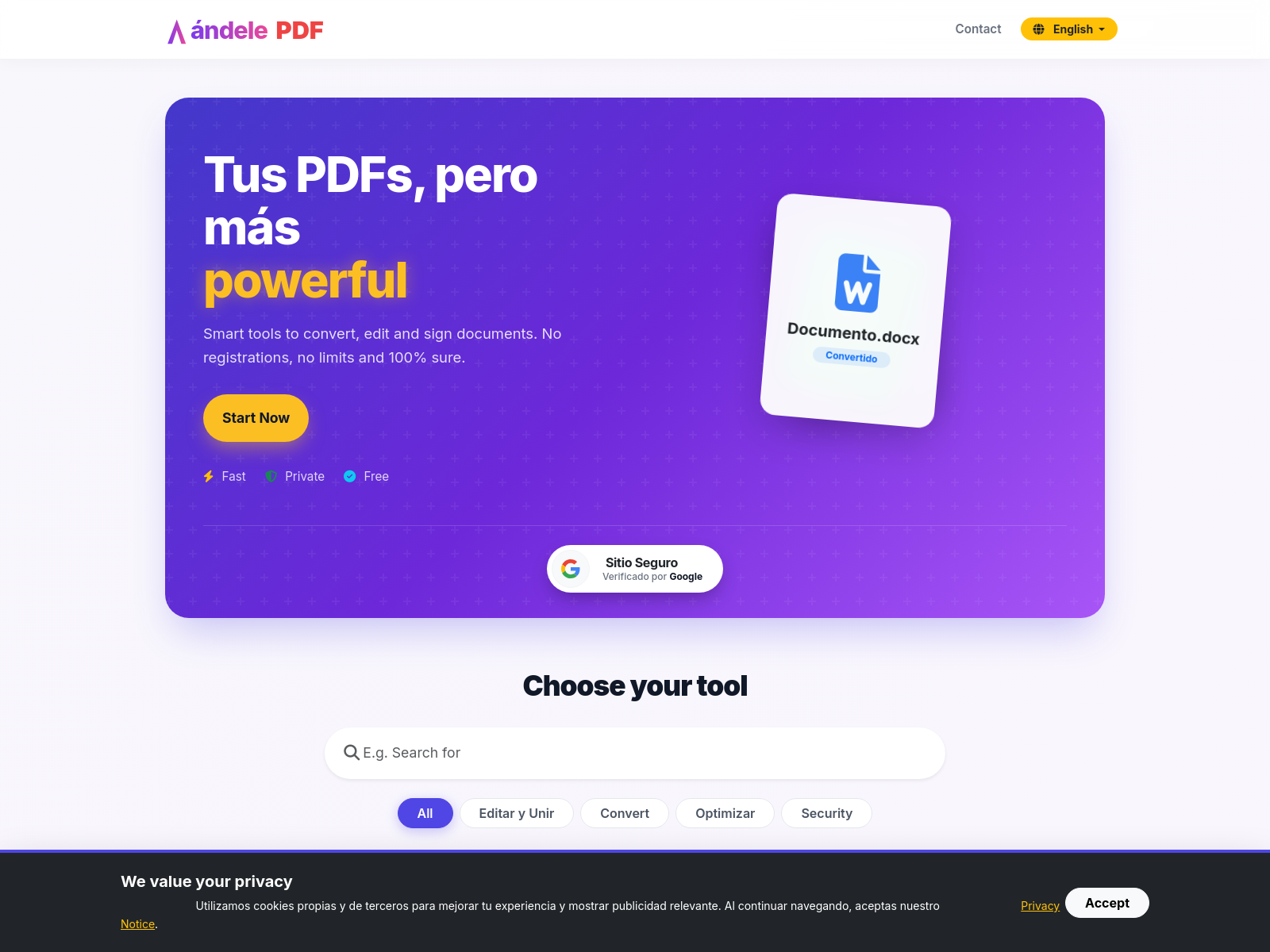 ÁndelePDF是一款在浏览器中运行的PDF工具套件,处理敏感文档无需注册,文件60分钟后自动删除。