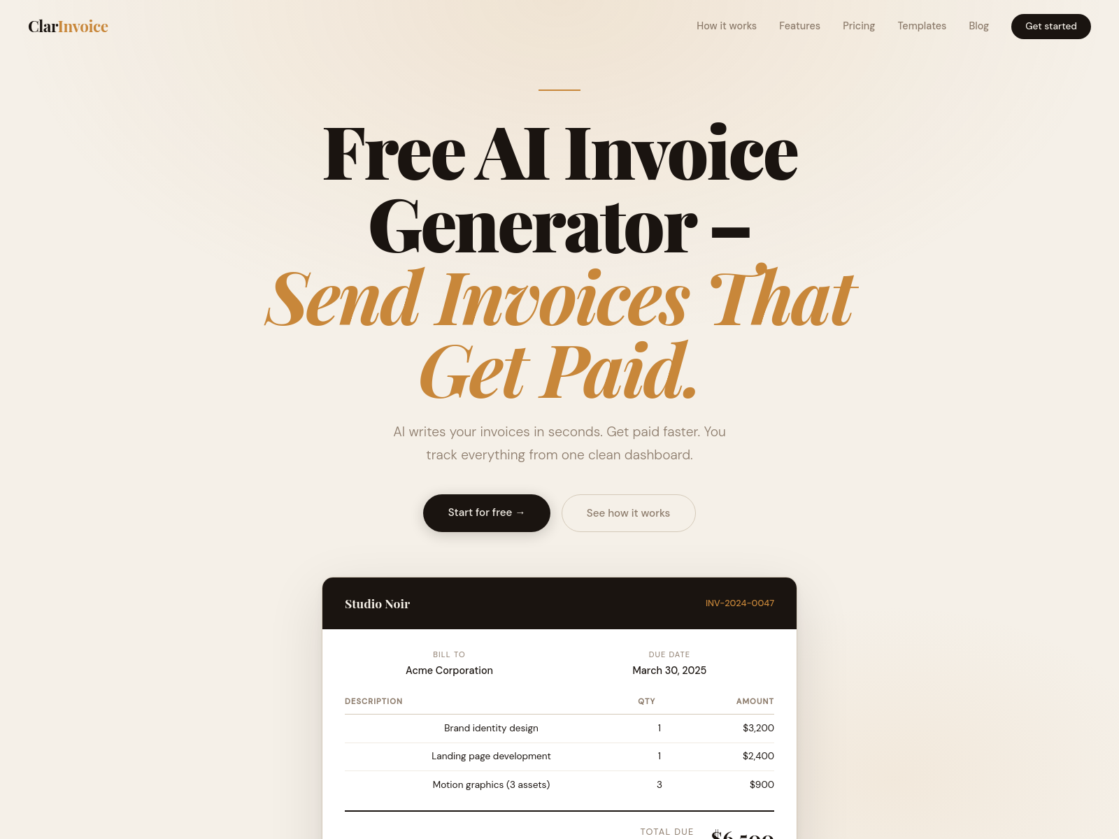 ClarInvoice是一款支持自然语言生成发票的免费工具,一键生成PDF,提供追踪仪表板,无广告。