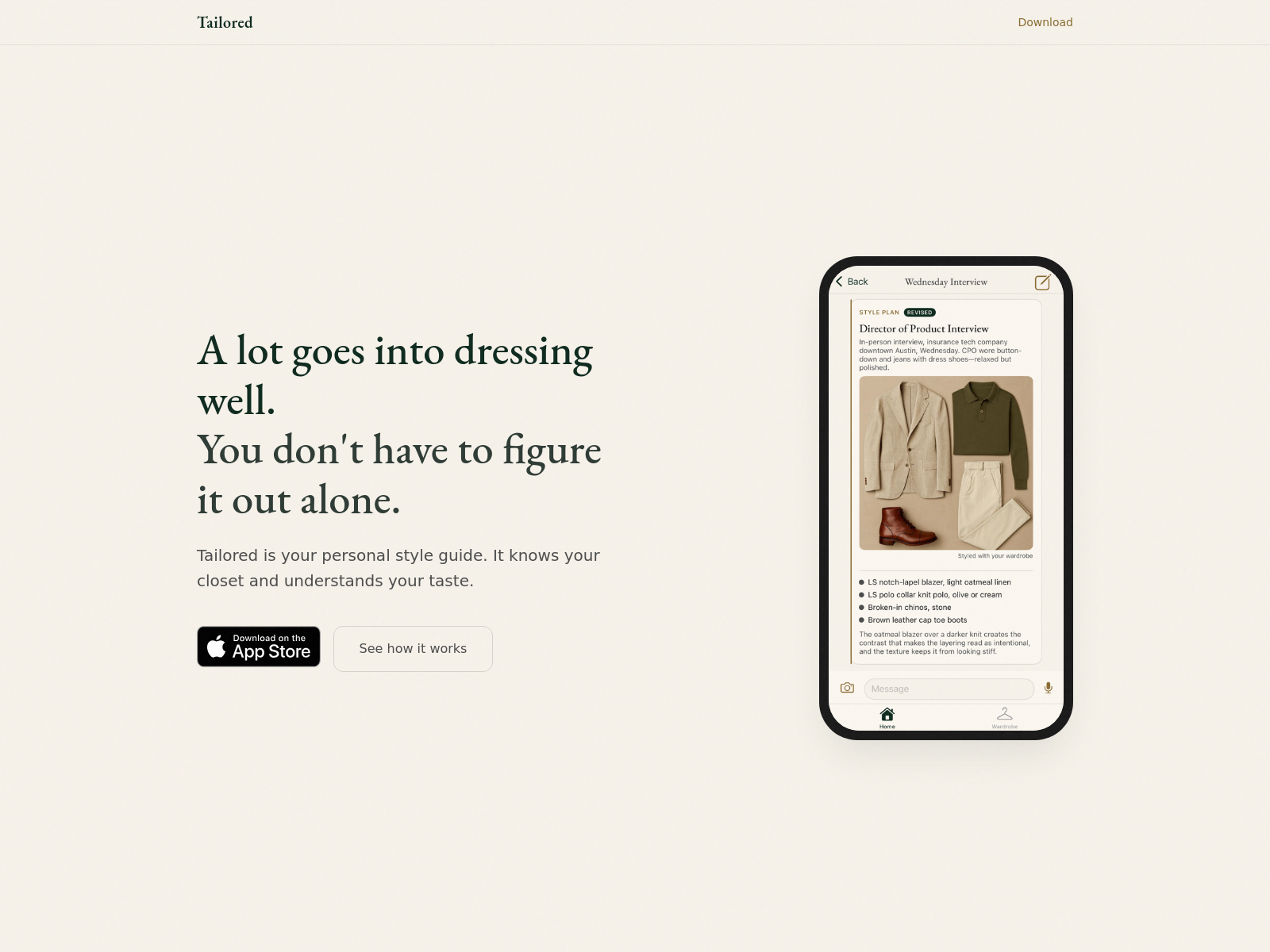 Tailored是一款基于已有衣物智能推荐穿搭的个人风格指南应用,支持扫描衣橱并结合行程推荐搭配。