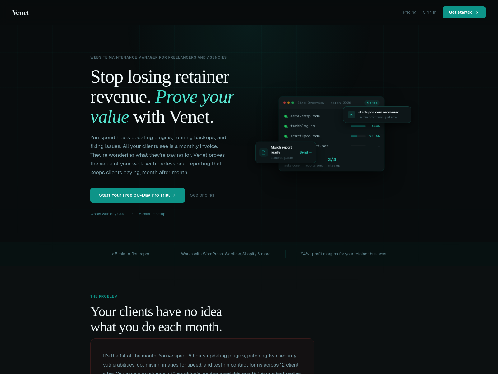 Venet是一款为独立网页开发者设计的维护任务管理与自动化报告工具,可收集网站可用性、SSL证书等数据并生成品牌化月度报告。
