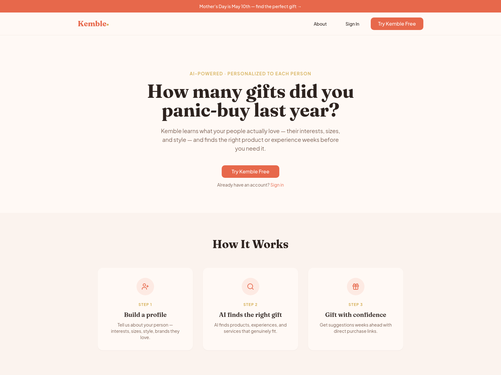 Kemble是一款AI驱动的个性化礼物推荐应用,通过个人兴趣档案生成贴心礼物建议,支持自主维护提升推荐精准度。