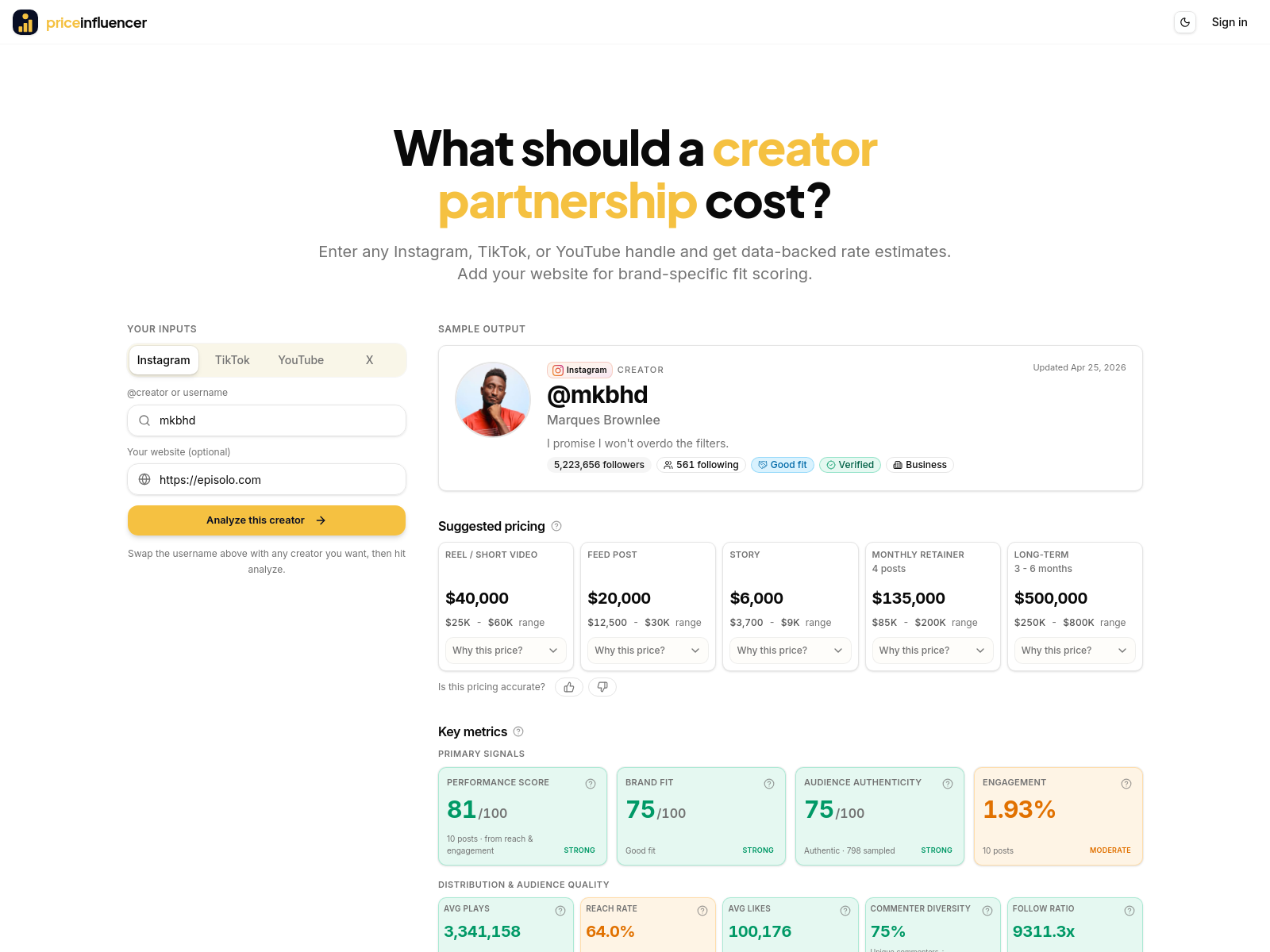 Influencer Pricing Analyzer是一款基于AI的网红定价分析工具,可为Instagram、TikTok、YouTube账号生成真实互动数据驱动的定价建议。
