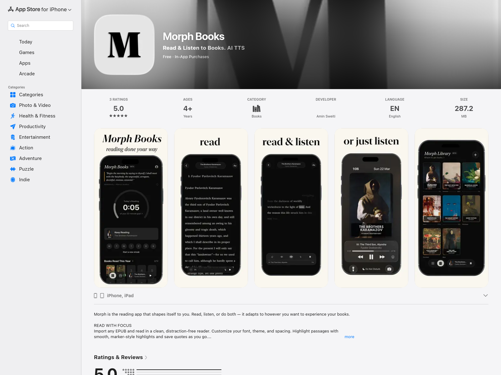 Morph Books是一款支持阅读与听书无缝切换的电子书应用,可导入EPUB和网页文章,实现文字语音同步高亮。