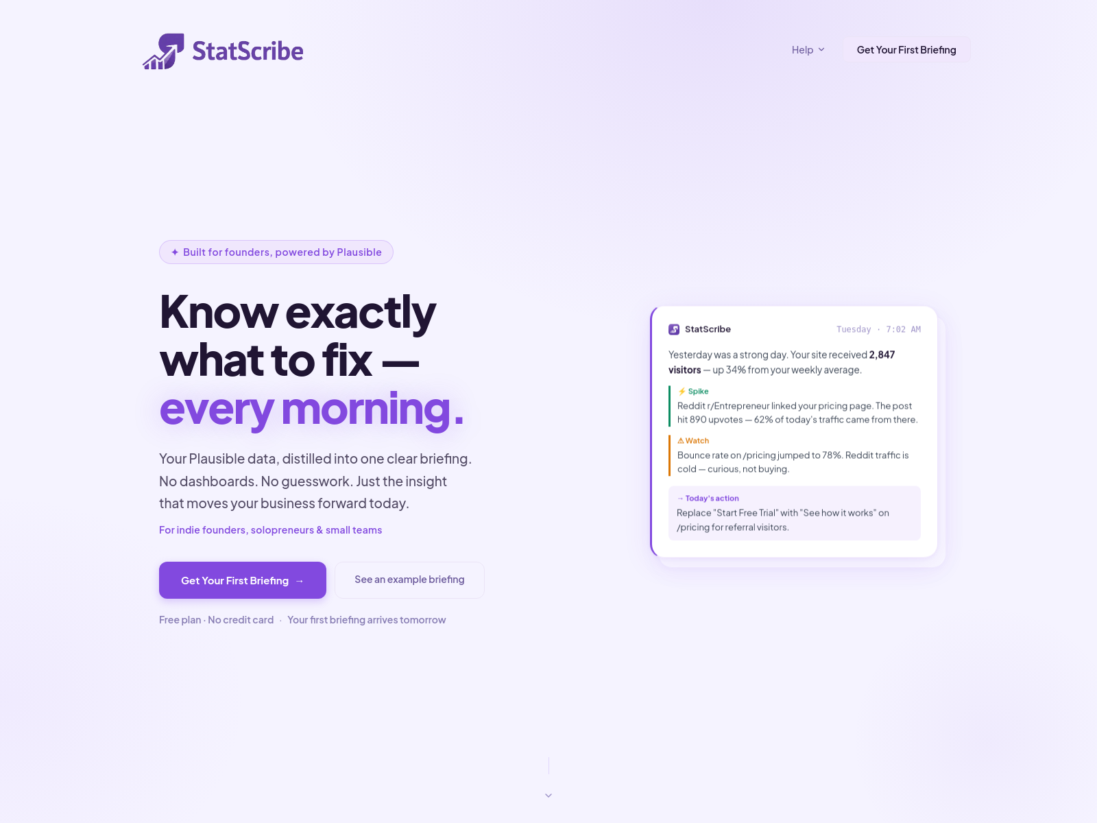 StatScribe是一款基于Plausible的数据智能分析工具,提供简洁的每日数据摘要与可操作建议,帮助快速理解网站流量表现。