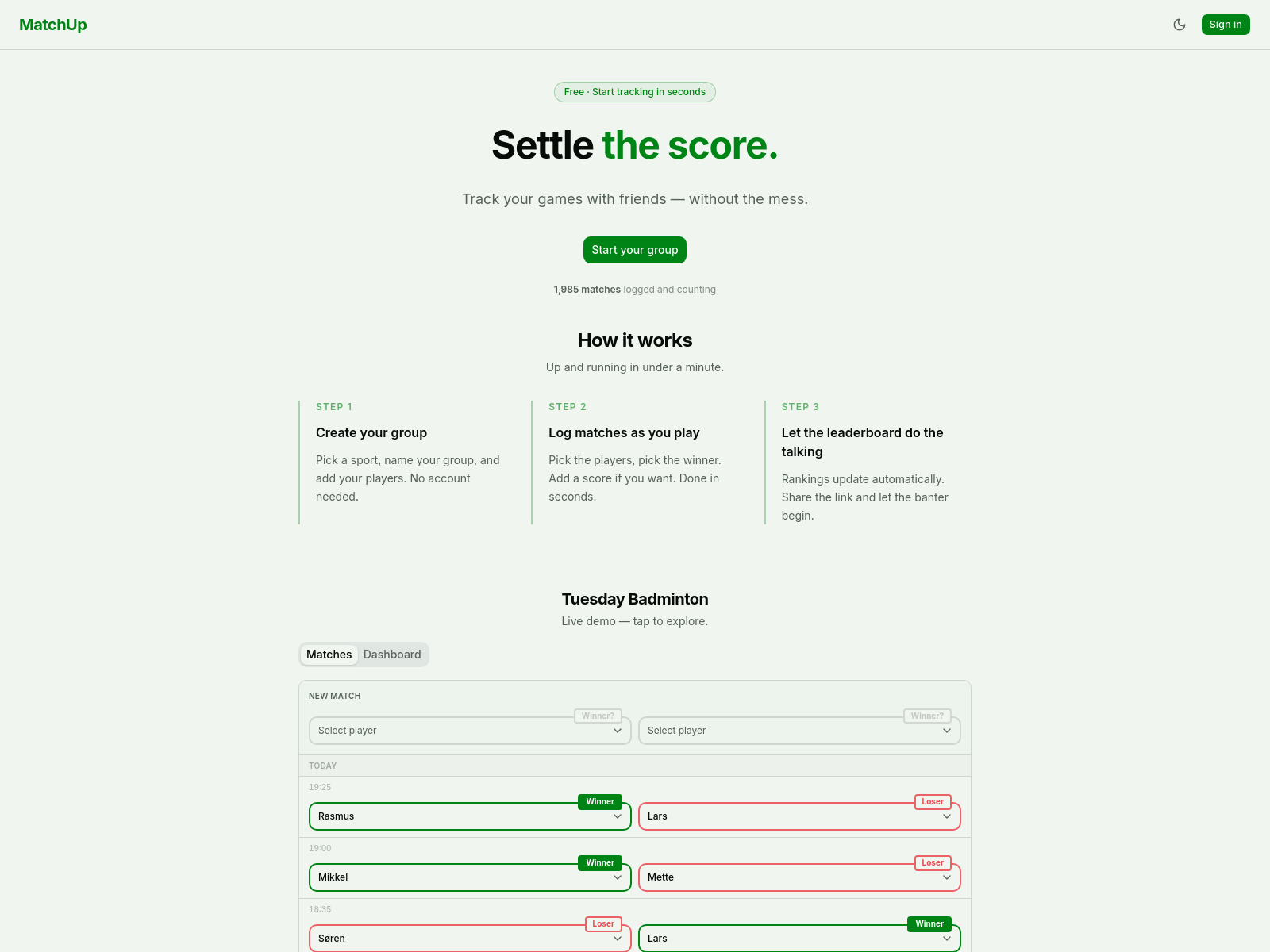 MatchUp是一款用于休闲运动团体的实时赛事数据追踪工具,支持多人协作记录比赛结果,避免谷歌表格延迟与冲突。