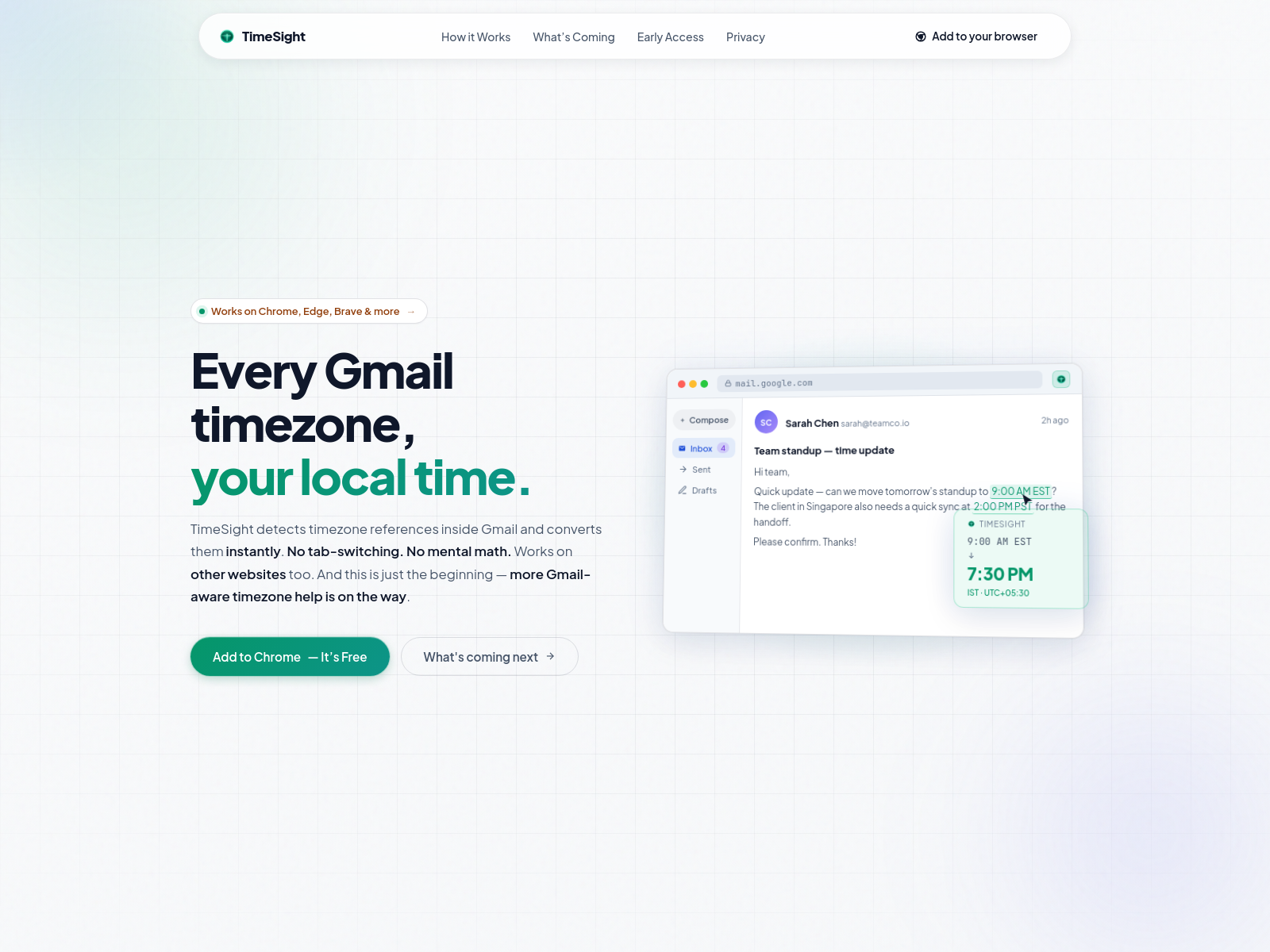 TimeSight是一款在Gmail中实时转换时区的Chrome扩展,支持30多个时区缩写,可自动检测并即时转换邮件中的时区信息。