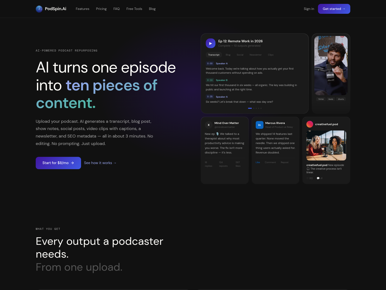 PodSpin是一款AI工具,可将单个播客节目快速生成10种内容,支持音频、视频或YouTube链接输入,自动生成字幕、博客、社交媒体帖文等。