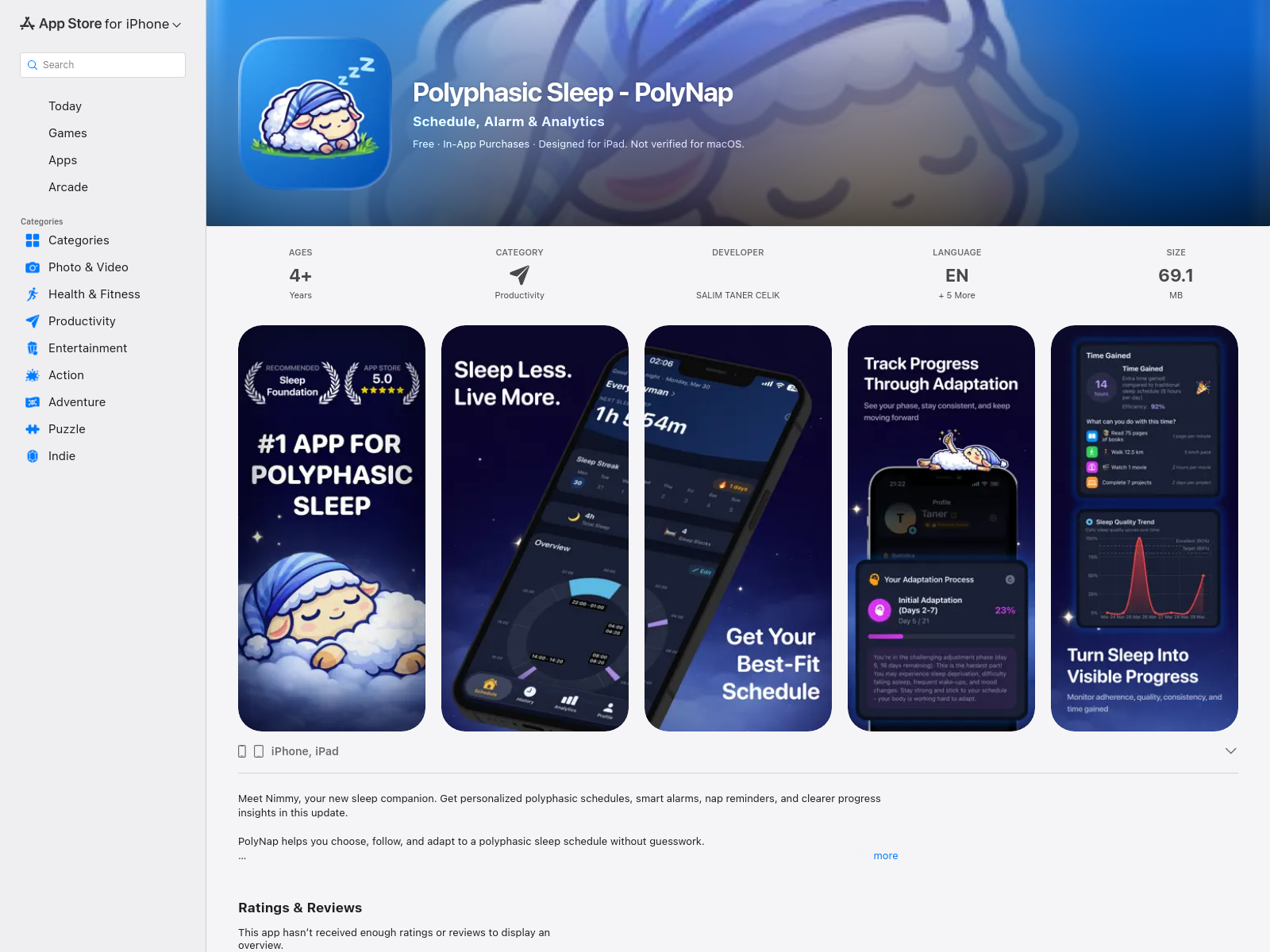 PolyNap是一款帮助用户遵循双相/多相睡眠计划的iPhone应用,提供日程推荐、时间线可视化和闹钟提醒功能。