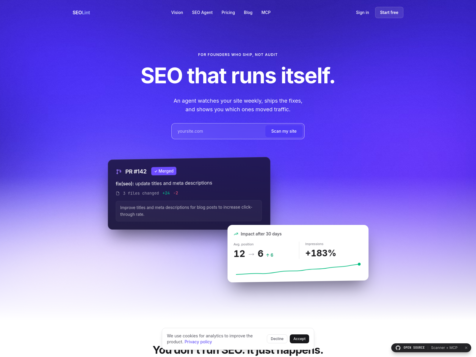 SEOLint是一款基于MCP协议的SEO审计工具,可连接Claude并自动扫描网站问题,生成结构化修复建议。