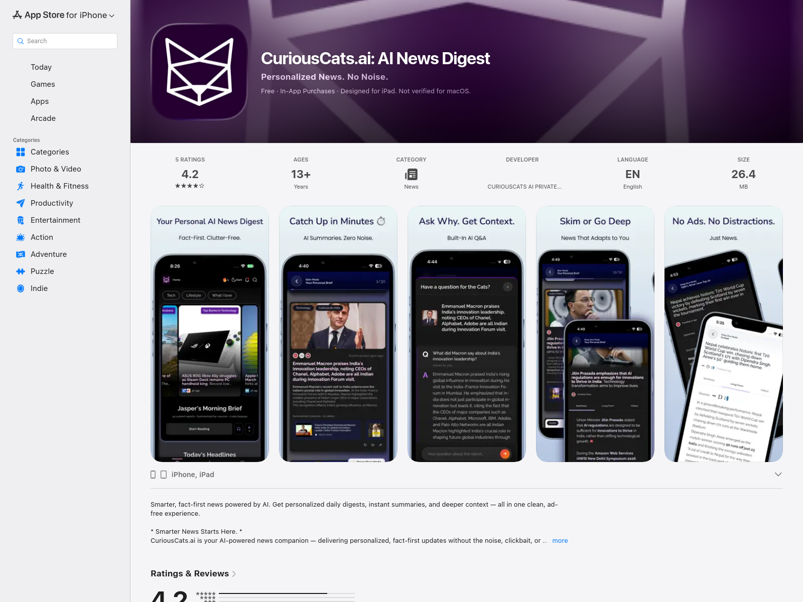 CuriousCats AI是一款AI新闻摘要应用,提供故事总结、多角度分析和问答功能,区别于传统新闻聚合器。